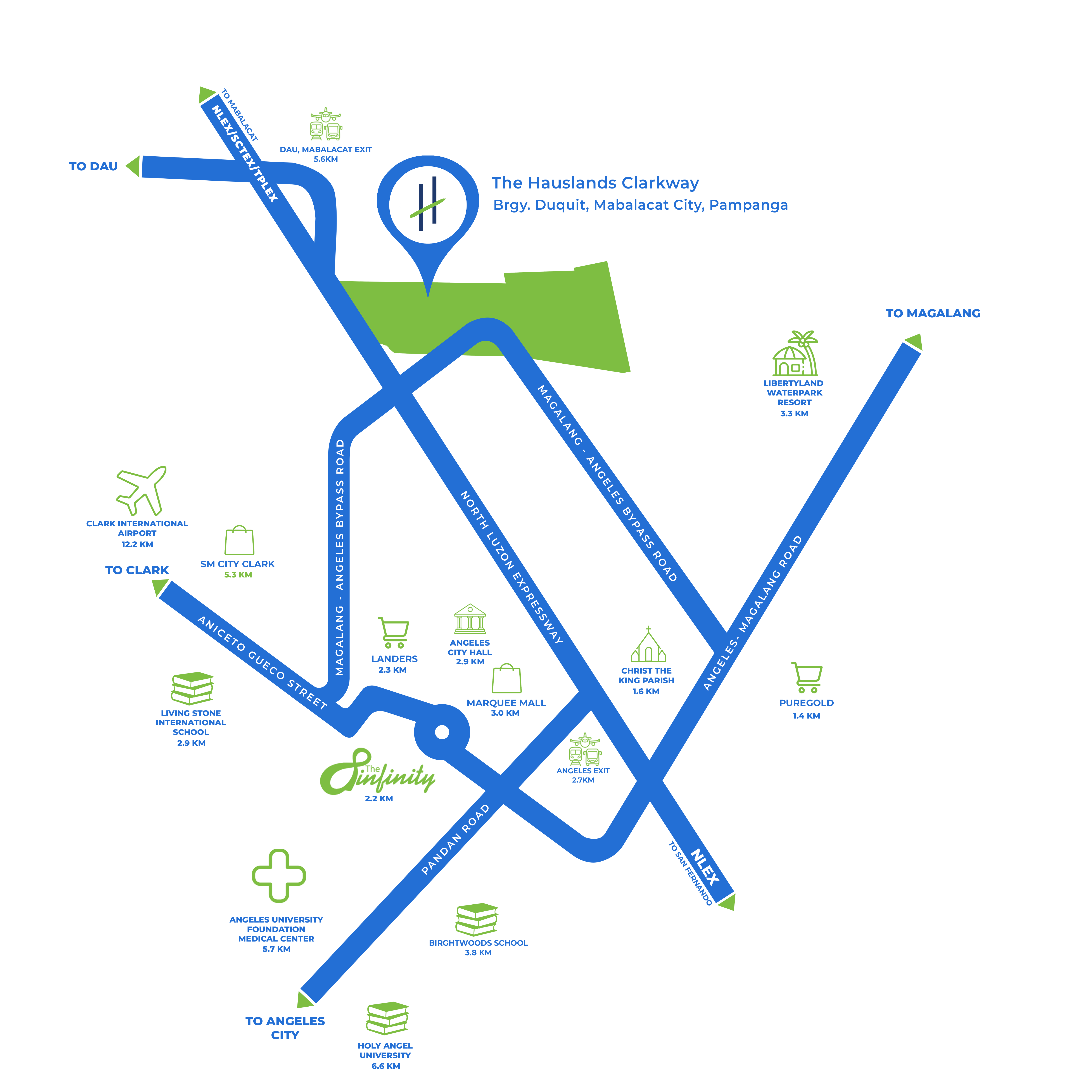 The Hauslands Clarkway is strategically located in Brgy. Duquit, Mabalacat City, Pampanga, offering convenient access to essential establishments and key destinations. It is situated just a few kilometers from: